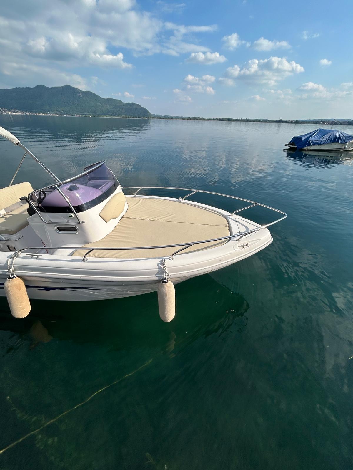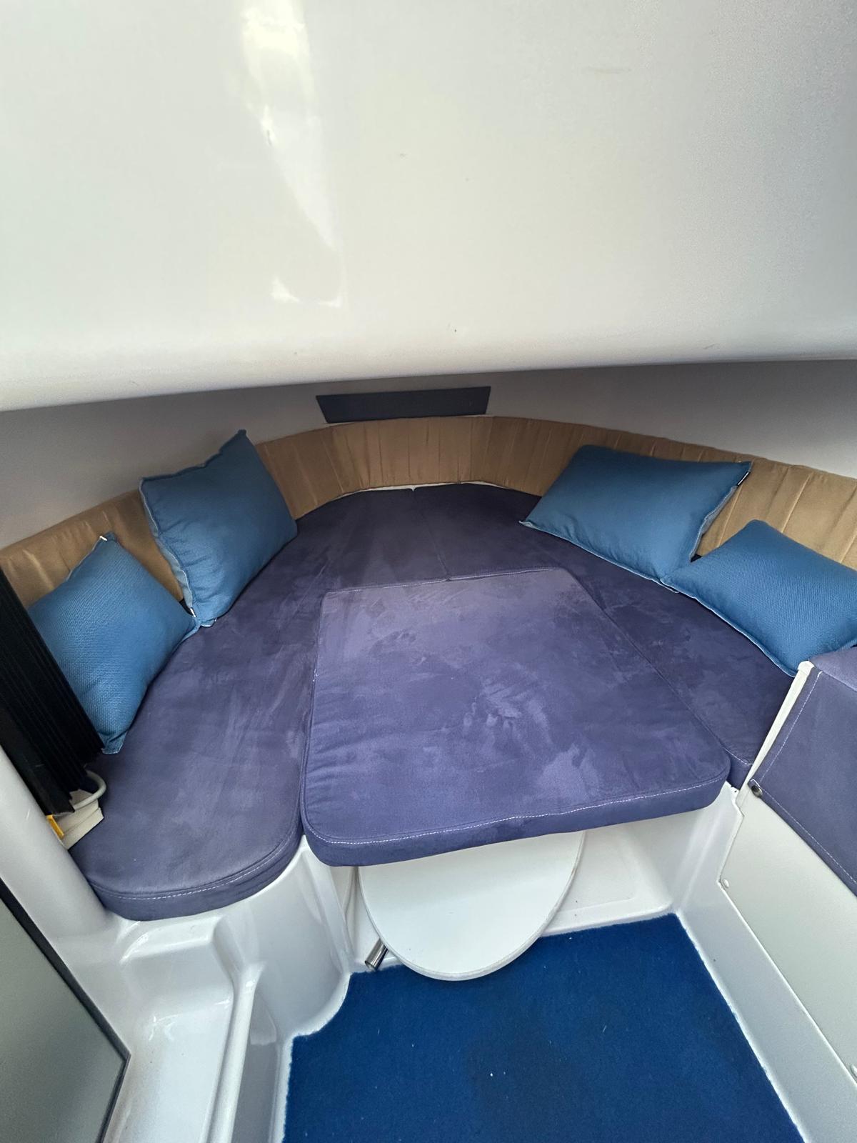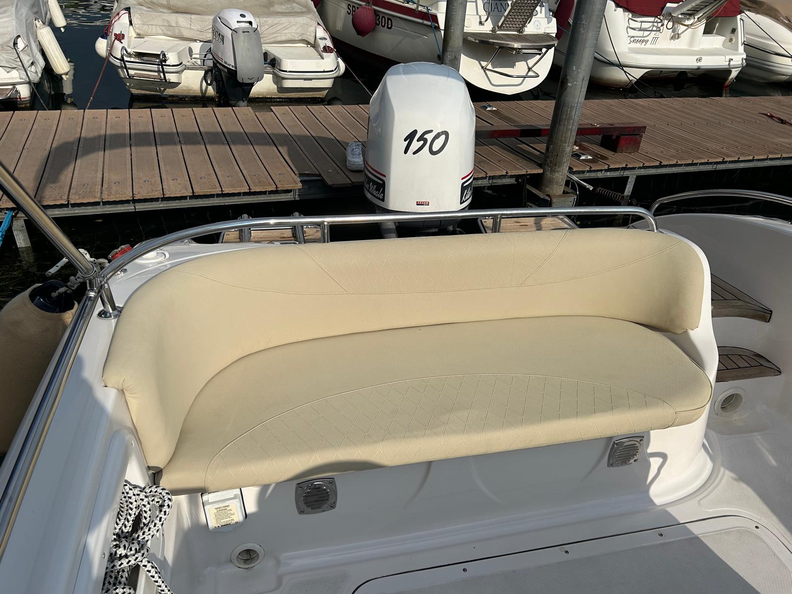 Cuscineria esterna completamente rifatta nella primavera 2025, ampio prendisole di prua, divanetto di poppa.