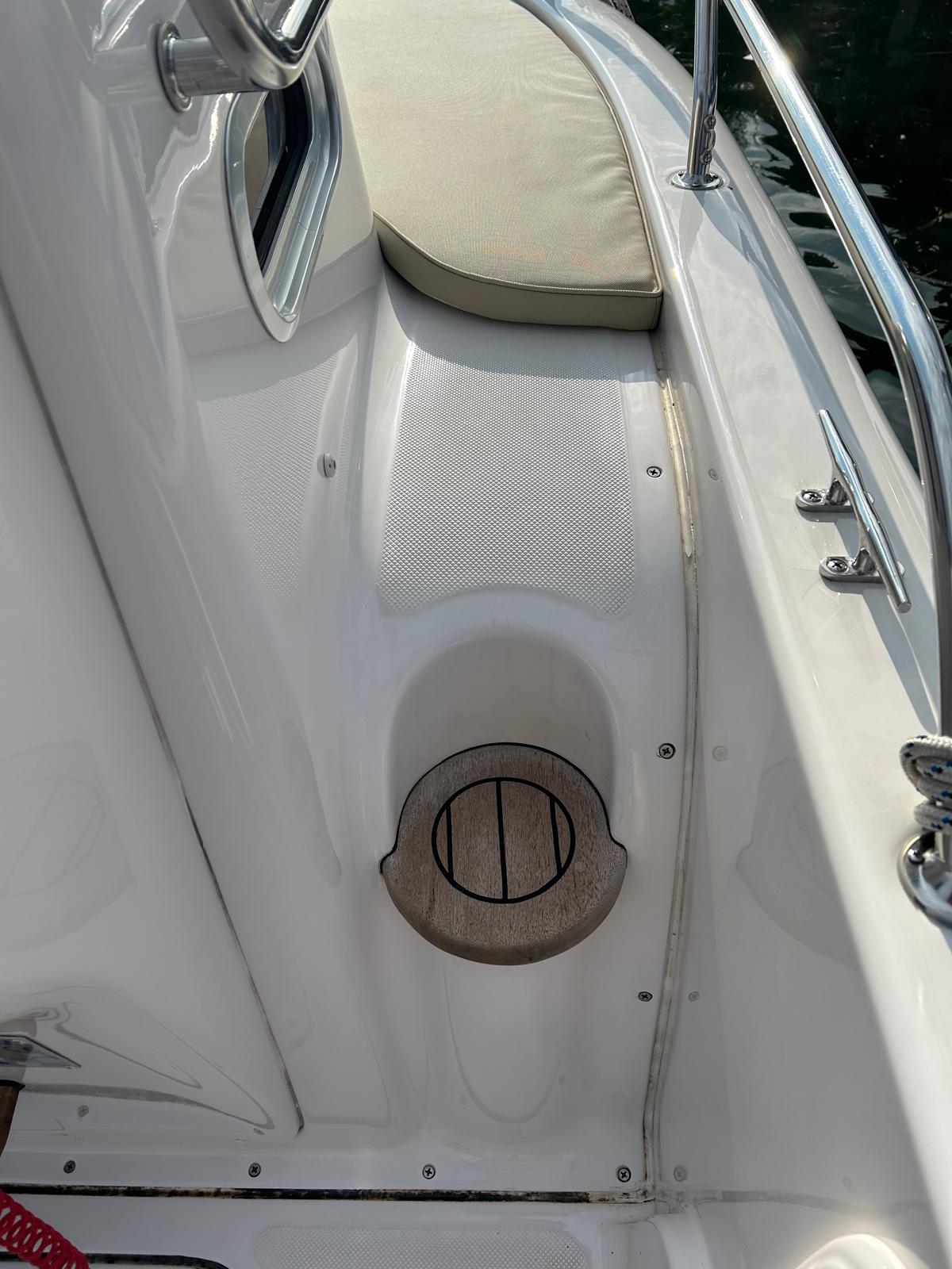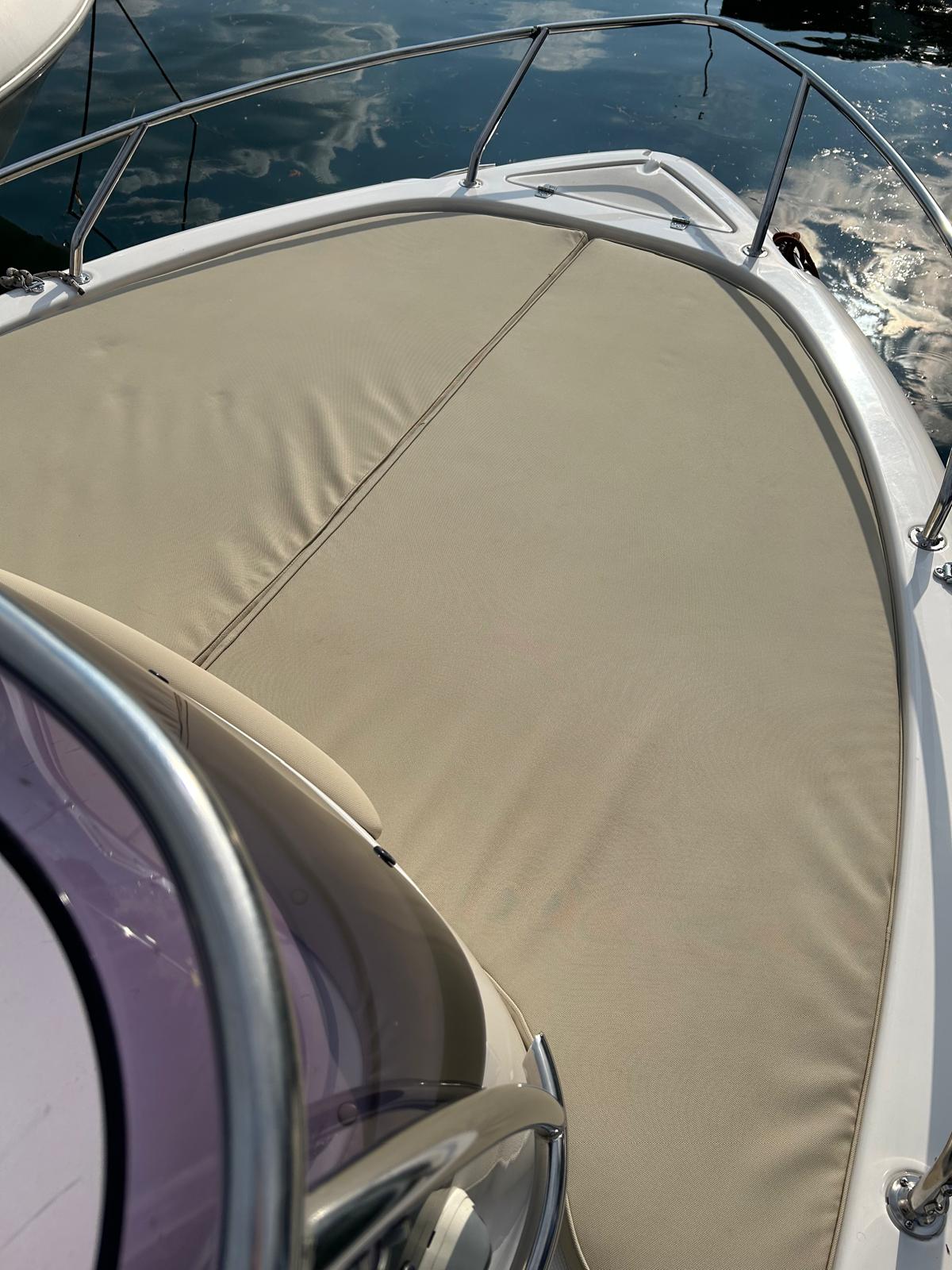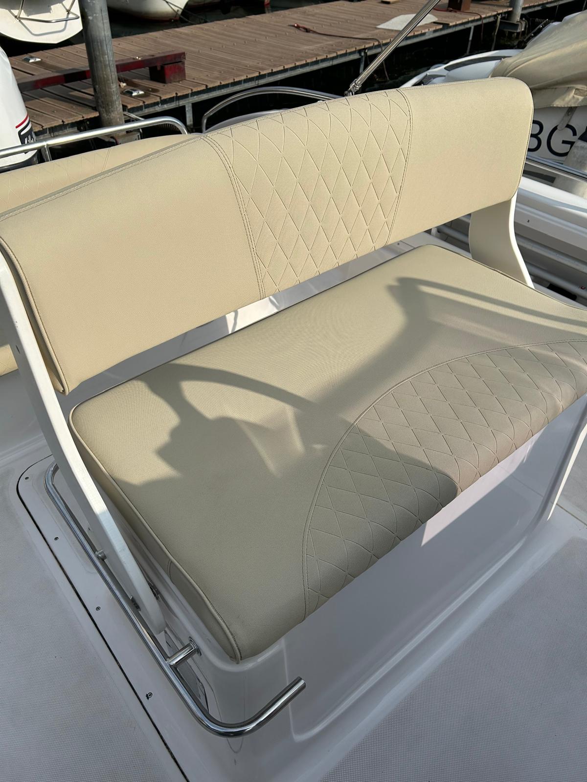 Cuscineria esterna completamente rifatta nella primavera 2025, ampio prendisole di prua, divanetto di poppa.